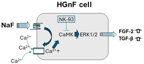 G proteins on the plasma membrane of cells are classified into four families (Gs, Gi, Gq, and G12). NaF activates Gs signaling on fibroblasts, promoting adenylate cyclase activity and the opening of calcium ion channels, leading to Ca2+ influx and subsequent CaMKII activation []. Previous studies have demonstrated NaF-induced Gs activation and intracellular Ca2+ mobilization in rat glioma cells. Our study revealed phosphorylation of ERK at 30 and 60 min after NaF stimulation, indicating CaMKII involvement [,]. Moreover, the inhibition of CaMKII with KN93 attenuated NaF-induced ERK phosphorylation in our study, in consistency with the findings of Bogatcheva et al. []. Furthermore, our results show that the inhibition of CaMKII by NK93 suppressed the gene and protein expressions of FGF-2 and TGF-β. Ikushima et al. and Zhao et al. have already demonstrated that the expression of FGF-2 and TGF-β increased via the phosphorylation of ERK [,]. Therefore, the inhibition of CaMKII may attenuate the phosphorylation of ERK, suppressing the expressions of FGF-2 and TGF-β. These findings, coupled with those of our study, suggest that NaF stimulation of HGnFs increases FGF-2 and TGF-β expressions by activating Gs-coupled receptors, leading to CaMKII activation and subsequent ERK phosphorylation downstream of the receptor (Figure 7). This may contribute to fibroblast activation and ECM protein remodeling.