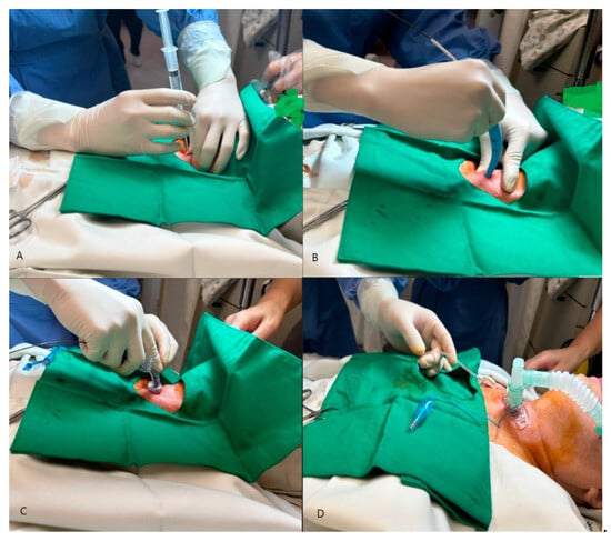 Percutaneous dilatational tracheostomy (PDT): (A) Initial pucture with needle and syringe, (B) Insertion of guide wire and dilatation of the tract with dilator, (C) Placement of tracheostomy tube, (D) Inflation of the T-tube and connection to the ventilator.