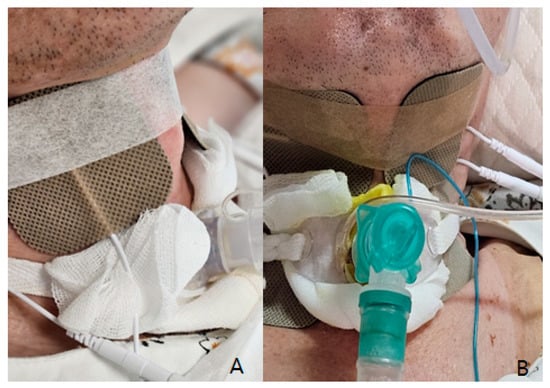 Electrical stimulation therapy: (A) For swallowing (horizontal taping between Adams apple), (B) For vocalization rehabilitation (vertical taping lining deep tongue muscle and muscles around the vocal cords).