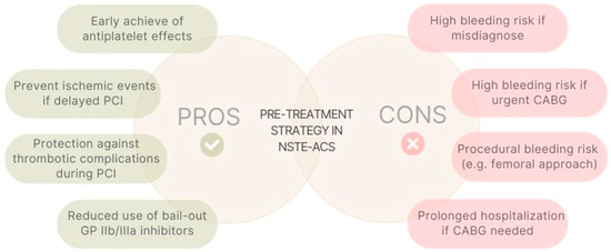 A current key issue is the timing of P2Y12i administration. The routine pre-treatment with a P2Y12i in NSTE-ACS patients in whom coronary anatomy is not known and early PCI (<24 h) is planned is no longer recommended [2]. This recommendation is supported by the ACCOAST trial, which failed to demonstrate a reduction in ischemic events at 30 days after a prasugrel loading dose prior to (median of 4.3 h) versus at the time of PCI, but also showed a significantly increased bleeding risk [14]. A pre-treatment strategy could have a theoretical advantage in helping achieve an early anti-platelet effect since oral drugs have a relatively slow onset of action. However, misdiagnosis and bleeding risk, as well a prolonging hospitalization if coronary artery bypass graft is performed, can tip the risk–benefit balance in favor of avoiding pre-treatment [15,16] (Figure 1). Therefore, an assessment of coronary anatomy before the administration of a P2Y12 inhibitor appears to be the most reasonable strategy in an ACS setting, unless invasive management is delayed (>24 h) and the patient’s bleeding risk is low [17].