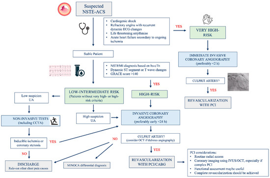 Early risk stratification upon admission is essential for a tailored therapeutic strategy in patients with NSTE-ACS because those at a higher risk benefit the most from revascularization [2,40,41,42] (Figure 2). There is a consensus on basing the initial short-term risk stratification on a combination of clinical history, symptoms, vital signs, physical examination, EKG findings, and hs-cTn levels.