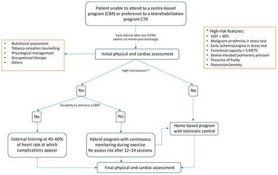 In this scenario, cardiac telerehabilitation (CTR) can be an upcoming alternative to center-based cardiac rehabilitation (CBCR) to overcome referral barriers [90]. There are several studies that show both safety and cost effectiveness, even implementing high-intensity interval training. However, there are several drawbacks to these programs. The structure of an optimal program is still uncertain as most studies are small and their methodology is variable. The ideal candidate profile for CTR is not well established [91]. Several factors have been related to a lower adherence to CTR, including older age, lower educational level, lower exercise capacity, and coronary artery bypass grafting [90,91]. Importantly in CTR, the patient’s or at least family’s knowledge on technology systems must be adequate. Patients at a high risk of events after the initial assessment (e.g., ventricular arrhythmias or induced ischemia in stress test, persistent angina, or low ventricular ejection fraction) might need cardiac monitoring during exercise, thus leading to the recommendation of a CBCR program. An intermediate approach to this problem could be hybrid programs, which can include an initial part of CBCR followed by a CTR once the risk of adverse events is proven to be low (Figure 4). Initial experiences show similar short-term benefits compared to CBCR [92] and, along with CTR, they could help to improve patients’ adherence to CR programs. Nevertheless, and similarly to CTR, the optimal structure of these programs is yet to be elucidated, with there being a lack of long-term evidence [93].