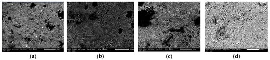 Scanning Electron Microscopy of (a) control Omnichroma (Yamaguchi, Japan), (b) Omnichroma (Yamaguchi, Japan) immersed in coffee for 10 days, (c) Omnichroma (v) immersed in wine for 10 days, (d) Omnichroma (Yamaguchi, Japan) immersed in Coca-Cola for 10 days at a magnification of ×500.