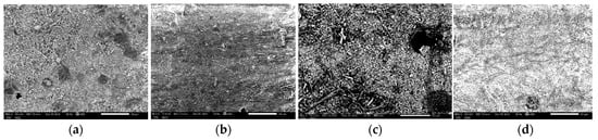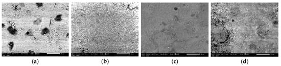 Scanning Electron Microscopy images of (a) control Herculite Ultra XRV (Kerr, Italy) (b) Herculite Ultra XRV (Kerr, Italy) immersed in coffee for 10 days, (c) Herculite Ultra XRV (Kerr, Italy) immersed in wine for 10 days, (d) Herculite Ultra XRV (Kerr, Italy) immersed in Coca-Cola for 10 days at a magnification of ×500.
