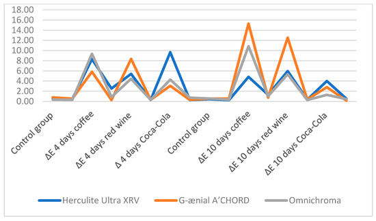On day 4, Herculite Ultra XRV (Kerr, Italy) exhibited the largest difference among all three substances when immersed in Coca-Cola, with a mean of M = −9.02, p < 0.00. According to MANOVA, this indicates that the mean Δ value decreased by 9.02 for the composite kept in Coca-Cola for 4 days compared to the control group. By day 10, red wine caused the largest mean difference in ΔE, with M = 5.52, p < 0.00, signifying a decrease of 5.52 in the mean ΔE value for the composite kept in red wine for 10 days compared to the control group.