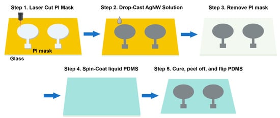 Silver nanowires (AgNWs) were synthesized by a modified polyol process [29]. Briefly, 60 mL of 0.147 M polyvinylpyrrolidone (PVP) (Mv∼40,000; Sigma-Aldrich, St. Louis, MO, USA) in ethylene glycol (EG) was added to a round-bottomed flask suspended in an oil bath that was heated to 151.5 °C and magnetically stirred at 260 rpm. After 1 h, 200 μL of a 24 mM CuCl2 (CuCl2·2H2O, 99.999+%; Alfa Aesar, Haverhill, MA, USA) solution in EG was added and heated for 15 min. Lastly, 60 mL of 0.094 M AgNO3 (99+%; Sigma-Aldrich, St. Louis, MO, USA) solution in EG was added, and the reaction was left to proceed for 2 h. The products were washed first with acetone and then several times with ethanol. The produced nanowires had an average length and diameter of approximately 25 μm and 100 nm, respectively. AgNWs in ethanol were drop-casted on a pre-cleaned glass slide with a patterned mask with a diameter of 3.2 cm made by laser cutting Kapton tape. The ethanol was evaporated at 50 °C and the process was repeated several times, producing a thickness of 3.56 ± 0.39 μm for the AgNW film. The sheet resistance and electrical conductivity of the AgNW film were 0.154 ± 0.018 Ω sq−1 and (1.840 ± 0.220) × 106 S m−1, respectively. Next, liquid PDMS (Sylgard 184, Dow Inc., Midland, MI, USA) in the weight ratio of 10:1 of prepolymer to cross-linker was degassed and spin-coated at 400 rpm for 30 s on the AgNW film. After curing at 50 °C for 3 h, the AgNW/PDMS electrode was peeled off from the glass slide, revealing surface-embedded AgNWs in PDMS. A cable from a commercial FES electrode (PALS® Electrodes, Axelgaard, Fallbrook, CA, USA) was attached to the AgNW/PDMS electrode using silver paste to connect to the current-controlled stimulator (Rehastim1, HASOMED GmbH, Magdeburg, Germany). The fabrication process of the AgNW/PDMS electrode is schematically shown in Figure 1. The thickness of the AgNW film was measured using a Keyence VKX1100 confocal laser scanning microscope. A 4-probe method was used to determine the resistance of the AgNW film. The sheet resistance (Rs) was calculated using the formula Rs = (Rw)/l, where R, w, and l represent the resistance, line width, and length of the AgNW film, respectively. The electrical conductivity (σ) was calculated using the formula σ = l/(RA), where l, R, and A represent the length, resistance, and cross-sectional area of the AgNW film, respectively.