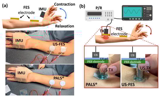 (a) Experimental setup for evaluation of the effectiveness of the US-FES electrode. While the wrist extensor is contracted by FES, an IMU tracks the angle of the wrist. The setup includes a commercial FES electrode (PALS®) and the US-FES electrode. (b) Experimental setup for the feasibility test of the US-FES electrode using a 3.5 MHz single-element US transducer. The US transducer collects A-mode US signals from the muscle to assess if the electrode is compatible with ultrasound. The feasibility test involves placing the US transducer on top of both the commercial FES electrode and the US-FES electrode.