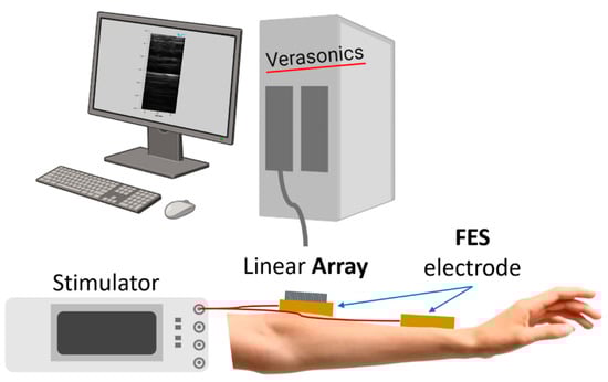 Multiple monitoring modalities are currently employed, including electromyography (EMG), ultrasound (US) imaging, magnetic resonance imaging (MRI), etc. Among them, surface electromyography (sEMG) is commonly used as a non-invasive technique for monitoring muscle activity. However, sEMG is restricted by factors such as a low signal-to-noise ratio (SNR), the capacity to solely monitor superficial muscle activity, the degradation of signal due to fatigue, and the influence of sensor positioning on sensitivity [12,13]. Furthermore, the existence of stimulation artifacts during FES poses a challenge to simultaneously measure EMG signals and perform muscle stimulation [14]. Within the medical field, US imaging stands out as a widely utilized non-invasive technique for investigating the morphological structure of tissue. It has found extensive applications in assessing various aspects including muscle size, thickness, fatigue, and treatment effectiveness [15,16,17]. In addition, US serves as a reliable indicator of muscle quality, encompassing parameters such as strength, size, volume, and physical function [18,19].