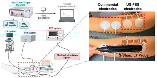 A single participant diagnosed with Parkinson’s disease (male, 67 years old) participated in this study. The aim was to assess the effectiveness of tremor suppression by using US-FES electrodes in conjunction with real-time B-mode US imaging during the electrical stimulation process. The participant was seated and instructed to perform two trials of a grasping motion, involving the action of picking up and holding a cup in response to a visual cue after 5 s. The commercial hydrogel FES electrodes (PALS® Electrodes, Axelgaard, Fallbrook, CA, USA) and US-FES electrodes were strategically placed on the participant’s Flexor carpi radialis (FCR) forearm. The application of stimulation commenced 15 s after initiation, with parameters of a 150 Hz frequency, 4 mA amplitude, and a 200 μs pulse width. The linear US transducer (Prodigy, S-Sharp, New Taipei City, Taiwan) was positioned above the electrodes, and an IMU (Yost Labs Inc., Portsmouth, OH, USA) was placed at the wrist joint. IMU signals were sampled at a frequency of 1000 Hz and synchronized with US plane wave images. A center frequency of 5 MHz and a sampling frequency of 20 MHz were used for US images, captured at 1000 fps using an external trigger programmed in MATLAB/Simulink, and implemented on a real-time target machine (Speedgoat, Liebefeld, Bern, Switzerland). During data collection, IMU signals were continuously recorded in real time, while the RF data of the US images were saved for each trial. The experimental setup is illustrated in Figure 4.
