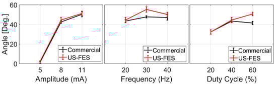 Evaluation of the effectiveness of electrical stimulation using the US-FES electrode on the wrist extensor response compared to the performance of the commercial FES electrode (PALS®), taking into account various stimulation parameters: current amplitude (5–11 mA), frequency (20–40 Hz), and pulse duty cycle (20–40%).