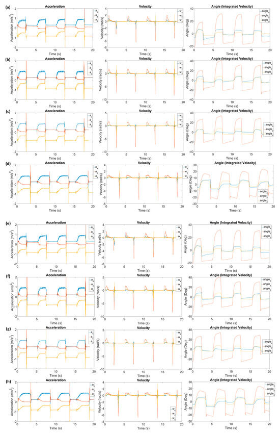 Representative time-series data (angular acceleration, angular velocity, and angular angle) collected by IMU during muscle extension induced by FES (stimulation onset at 0, 5, 10, and 15 s) using PALS® (a–d) and US-FES electrode (e–h) with different stimulation parameters: (a,e) 20 Hz, 8 mA, 40% (Base); (b,f) 20 Hz, 11 mA, 40%; (c,g) 40 Hz, 8 mA, 40%; (d,h) 20 Hz, 8 mA, 60%.