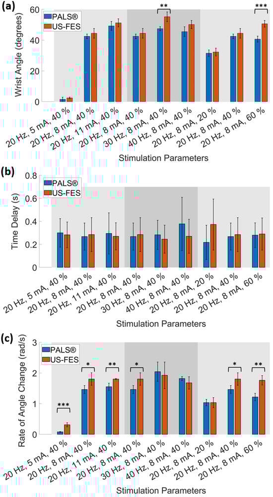 (a) Comparison of wrist extension angles, (b) the time delay between stimulation onset and the start of the muscle extension, and (c) rate of angle changes measured by IMU using different stimulation parameters (* for p < 0.05, ** for p < 0.01, and *** for p < 0.001).