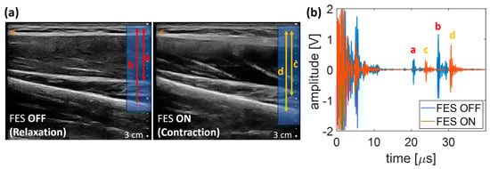 Figure 9a illustrates B-mode US images of the target muscle in states of relaxation and contraction of the wrist extensor, with the muscle layers serving as regions of interest. In the relaxed state, these muscle layers were situated approximately 1.50 cm and 2.10 cm below the skin surface, respectively. Following FES, the layers moved to 1.8 cm and 2.30 cm from the skin surface, respectively. Referring to the B-mode US images of the targeted muscle, the A-mode US signal from the muscle layers in the targeted muscle was collected and is shown in Figure 9b. The initial echo (a) from the upper muscle layer occurred at 20.60 μs, corresponding to a depth of 1.58 cm calculated from the TOF. The subsequent echo (b) at 27.25 is equivalent to 2.10 cm when in a relaxed state. During muscle contraction, the echo (c) at 23.75 indicated a depth of 1.83 cm. The following echo (d) observed at 30.30 indicated a distance of 2.30 cm, which closely aligned with the location of muscle layers seen in B-mode imaging.