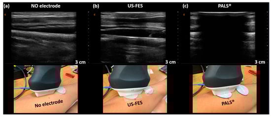 B-mode US imaging of the wrist extensor using a commercial ultrasound probe (Clarius, Vancouver, BC, Canada). US images of the layers of the muscle were (a) collected without any electrode present, (b) with the customized US-FES electrode, and (c) with the commercial FES electrode placed in front of the ultrasound probe to compare their effects on image quality. The position of the ultrasound probe is shown in the second row of pictures.