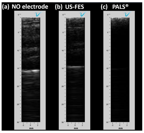 We initially assessed the US penetration capability of the US-FES electrode using a commercially available ultrasound probe (L7, Clarius, Canada) to obtain B-mode US images of the target muscle. Figure 11 represents the B-mode US image of the forearm muscle under three conditions: without the FES electrode (Figure 11a), with the US-FES electrode (Figure 11b), and with the PALS® commercial electrode (Figure 11c). As shown in Figure 11b, the area where the US-FES electrode was placed revealed an acoustic shadow in the B-mode images, attributed to the presence of the PDMS layer of the US-FES electrode. However, this shadow does not have a substantial impact on the quality of B-mode images, as the layers of the wrist extensor muscle remain clearly visible. In contrast, when the PALS® FES electrode was present, parts of the B-mode image were obstructed, therefore obscuring the visualization of target muscle anatomy. Only areas lacking the presence of the commercial electrode display a normal B-mode image. Thus, the US-FES electrode has the potential to be applied to biomedical US imaging for FES applications.