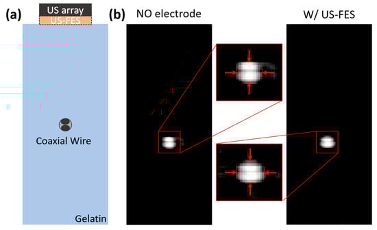 The lateral and axial resolution tests depending on the presence of the US-FES electrode. (a) The schematic of the phantom using coaxial cable. (b) The B-mode image of the phantom with the dynamic range from 0 to −6 dB (arrows from left and right represents lateral resolution and arrows from top and bottom indicated axial resolution).