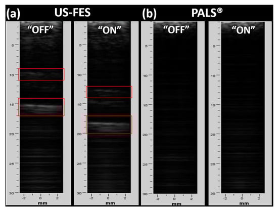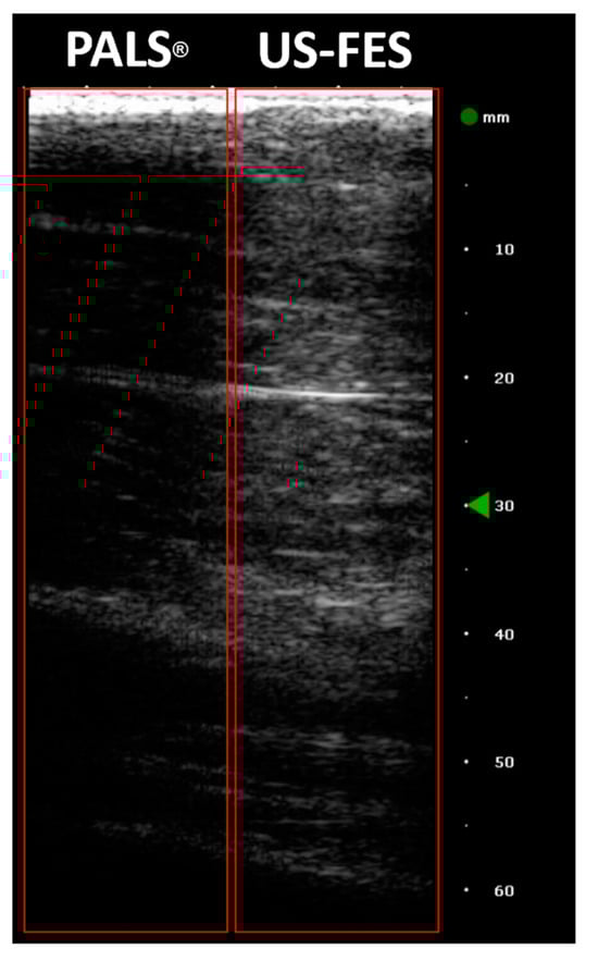 B-mode images from one trial with PALS® and US-FES electrodes (Red frame on left and right are the area where PALS® and US-FES electrode are placed, respectively. Green triangular arrow on the depth axis indicates the focus depth).