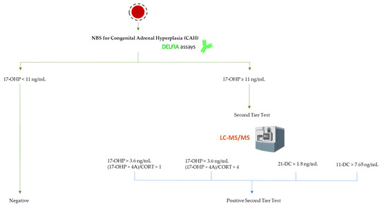- Cavarzere, P.; Camilot, M.; Palma, L.; Lauriola, S.; Gaudino, R.; Vincenzi, M.; Antoniazzi, F.; Teofoli, F.; Piacentini, G. Twenty Years of Neonatal Screening for Congenital Adrenal Hyperplasia in North-Eastern Italy: Role of Liquid Chromatography-Tandem Mass Spectrometry as a Second-Tier Test. Horm. Res. Paediatr. 2022, 95, 255–263. [Google Scholar] [CrossRef] [PubMed]