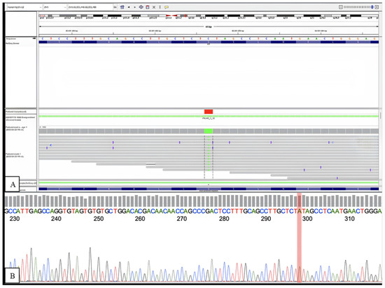 The NGS-detected variant was confirmed by Sanger sequencing through custom primers. The DNA sample was amplified via a polymerase chain reaction (PCR) performed in 30 μL reaction volume, including 22.25 μL of H2O, 3 μL of 10X PCR buffer, 2.1 μL of MgCl2 solution 25 mM, 0.5 μL of dNTPs 10 mM, 0.15 μL of AmpliTaq Gold polymerase, 1 μL of DNA, and 0.5 μL of forward and 0.5 μL of reverse primers. The amplification was carried out via a SimpliAmpTM thermal cycler (Termo Fisher Scientific, Waltham, MA, USA). The purification of the PCR products was performed via FastGene Gel/PCR Extraction (Nippon Genetics Europe, Düren, Germany), and PCR products have undergone Sanger sequencing via the SeqstudioGenetic Analyzer (ThermoFisher, Applied Biosystem, Foster City, CA, USA).