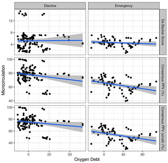 Correlation of oxygen debt with sublingual microcirculation variables during elective major and emergency non-cardiac surgery. PPV, proportion of perfused vessels.