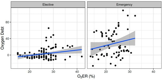 Correlation of oxygen debt with oxygen extraction ratio during elective major and emergency non-cardiac surgery. O2ER, oxygen extraction ratio.