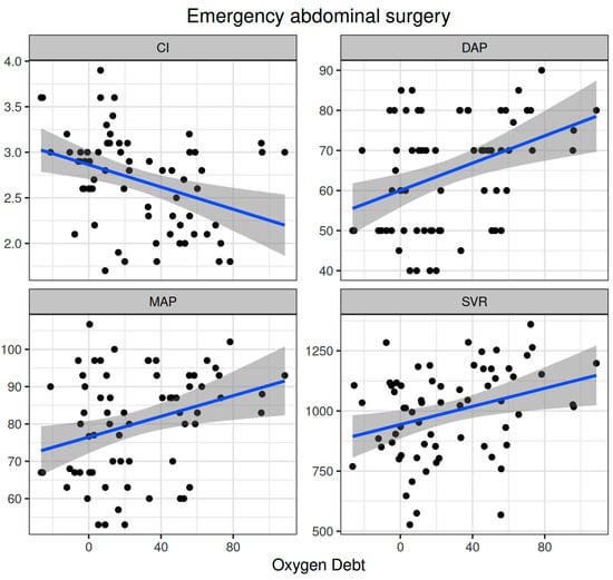 Correlation of oxygen debt with macrohemodynamic variables during emergency non-cardiac surgery. CI, cardiac index; DAP, diastolic arterial pressure; MAP, mean arterial pressure; SVR, systemic vascular resistance.