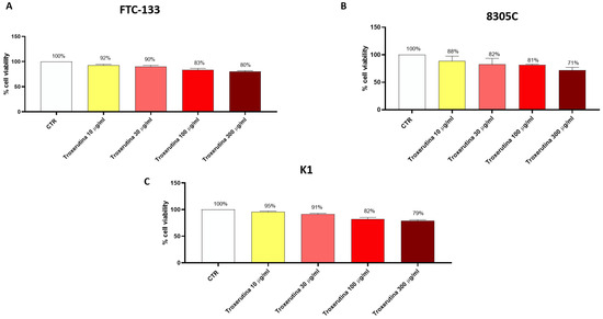 Cell viability of the FTC-133, 8305C and K1 cells was evaluated using a mitochondria-dependent dye for live cells (Tetrazolium dye; 3-(4,5-dimethylthiazol-2l)-2,5-diphenyltetrazolium bromide assay (MTT assay); M5655; Sigma-Aldrich) [16]. 8305C cells were plated on 96-well plates at a density of 4 × 104 cells/well to a final volume of 150 μL. After 24 h, FTC-133, 8305C and K1 cells were treated with Trox for 24 h at increasing concentrations of 10, 30, 100 and 300 μg/mL, dissolved in basal medium. After 24 h, cells were incubated at 37 °C with MTT (0.2 mg/mL) for 1 h; the medium was removed by aspiration, and then, cells were lysed with DMSO (100 mL). The extent of reduction in MTT to formazan was quantified by measurement of optical density at 540 nm (OD540) with a microplate reader, as previously described.