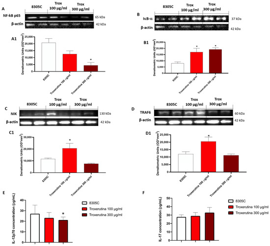 Trox treatment reduced the inflammatory response modulating the NF-κB pathway in 8305C cell lysates. The treatment with Trox at the concentrations of 100 and 300 μg/mL significantly reduced NF-κB/IκB-α pathway (Figure 4). IκB-α expression was increased ((B), densitometric analysis (B1)), while NF-κB, NIK and TRAF6 expression was reduced ((A,C,D), densitometric analysis (A1,C1,D1)). In the same way, IL12p70 and IL-17 concentration was evaluated by the ELISA kit assay. Our data demonstrated that Trox, at the concentrations of 100 and 300 μg/mL, reduced the concentration of these pro-inflammatory cytokines (E,F). * p < 0.05 vs. 8305C.