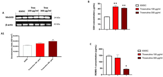 Trox reduced the production of free radicals and favored the expression of anti-oxidative proteins. Our data demonstrated via Western blot analysis of the 8305C cell lysates that Trox at the concentrations of 100 and 300 μg/mL favored the expression of MnSOD ((A), densitometric analysis (A1)). The ELISA kit assay showed that Trox increased the concentration of anti-oxidant protein GSH (B) and reduced the concentration of pro-oxidative protein ROMO1 (C). * p < 0.05 vs. 8305C; ** p < 0.01 vs. 8305C.