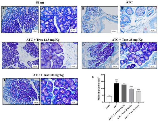 Reduction in the number of mast cells following Trox treatment. Trox treatment at doses of 12.5, 25 and 50 mg/kg reduced the accumulation of mast cells ((C–E1), score F) compared to the ATC group that showed a high number of mast cells ((B,B1), score F). The sham group did not present inflamed tissue and was therefore devoid of mast cells ((A,A1), score F). The results of histological evaluations are displayed at 10× and 40× magnifications. *** p < 0.001 vs. sham; ### p < 0.001 vs. ATC. Red circle indicated the mast cells localization (B1–E1).