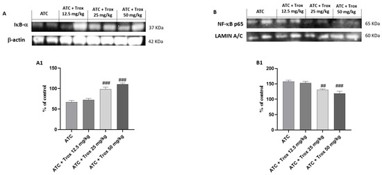 Trox treatment reduced the inflammatory state of the thyroid tissue. To confirm the in vitro studies, Western blot analysis of the thyroid tissue demonstrated that Trox, especially at the doses of 25 and 50 mg/kg, was able to increase the IκB-α levels ((A), densitometric analysis (A1)) and reduced the expression of NF-κB ((B), densitometric analysis (B1)) compared with the ATC group ((A,B), densitometric analysis (A1,B1)). ## p < 0.01 vs. ATC; ### p < 0.001 vs. ATC.