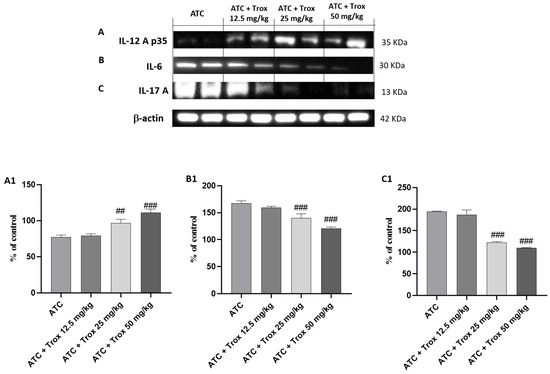 Treatment with Trox reduced the cascade of pro-inflammatory cytokines release. Western blot analysis demonstrated that Trox at doses of 12.5, 25 and 50 mg/kg increased the levels of IL-12Ap35 ((A), densitometric analysis (A1)) and reduced the expression of IL6 and IL-17A ((B,C), densitometric analysis (B1,C1)) compared with the ATC group ((A–C), densitometric analysis (A1–C1)). ## p < 0.01 vs. ATC; ### p < 0.001 vs. ATC.