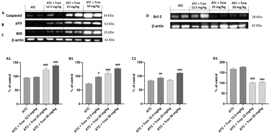 Trox-induced apoptotic process. Our data showed that Trox treatment, especially at high doses of 25 and 50 mg/kg, induced the apoptotic process increasing the expression of Caspase3, p53 and BID ((A–C), densitometric analysis (A1–C1)) compared with the ATC group. Moreover, bcl-2 expression was reduced after treatment with Trox ((D), densitometric analysis (D1)) compared with the ATC group. # p < 0.05 vs. ATC; ## p < 0.01 vs. ATC; ### p < 0.001 vs. ATC.