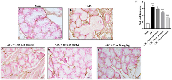 Troxerutin treatment reduced Ki67-positive cells. Ki67 expression was evaluated via histochemistry staining. The ATC group presented a high number of ki67-positive cells ((B), score F) compared with the control group (A), which did not present immunopositivity for the Ki67 marker. Treatment with Trox at doses of 12.5, 25 and 50 mg/kg reduced the number of Ki67-positive cells ((C–E), score F). The results of histological evaluation are displayed at 40× magnifications. *** p < 0.001 vs. sham; # p < 0.05 vs. ATC; ### p < 0.001 vs. ATC.