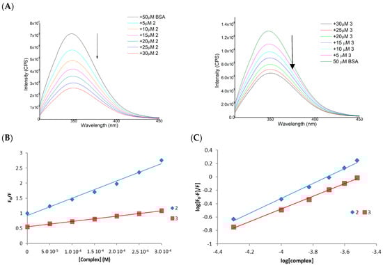 We have carried out fluorescence and UV-Vis spectroscopic experiments to study the affinity of [Cu{Au(Spy)(PTA)}2]PF6 (1) and [Zn{Au(PTA)(Spy)}2](NO3)2 (2) for albumin. These experiments are based on the quenching of the intrinsic tryptophan fluorescence emission undergone by BSA in the presence of increasing concentrations of the trinuclear complexes, which act as quenchers. The intrinsic fluorescence of BSA is susceptible to alterations in its local environment, and the binding or simple electrostatic interaction of molecules can result in modifications to its emission spectrum [56]. Fluorescence quenching experiments have been carried out, observing the emission of tryptophan at 341 nm upon excitation at 295 nm and increasing concentrations of compounds 2 and 3 with BSA. Before performing the quenching analysis, the fluorescence of the tested complexes was measured under the same experimental conditions, and no emission was observed in the range 295–300 nm. The fluorescence emission spectra of BSA after the interaction with trinuclear complexes are shown in Figure 1A. The addition of increasing amounts of the complexes to a BSA solution results in a significant reduction in fluorescence intensity without any shift in the emission maximum. The fluorescence data have been analysed using the Stern–Volmer equation so that the binding of the complexes to BSA and the consequent quenching of the emission can be quantified (Table 3). The corresponding plot F0/F versus [complex] (F and F0 are the corresponding intensities in the presence and the absence of the quencher agent) gives a linear plot in both cases (Figure 1B), characteristic of the presence of a single mechanism of quenching, either static or dynamic [57]. Static quenching implies the formation of a complex involving the quencher and the protein, generating deviations from linearity in Stern–Volmer plots, although only observable at high quencher concentrations. Collisions between the protein and the quencher cause dynamic quenching.
