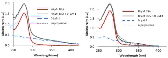 Furthermore, examination of the absorption spectra of the fluorophores can be used as a means of characterising static and dynamic quenching. Given the premise that static quenching entails complex formation, alterations in the absorption spectra of BSA are to be anticipated. Conversely, since dynamic quenching only affects the excited states of BSA, its absorption spectra would remain unaltered. The absorption spectra of BSA were recorded in the absence and presence of each compound at a concentration of 24 μM, as well as the absorption spectrum of the compound at the same concentration. A mathematical superposition of the spectrum of BSA and the spectrum of the compounds was calculated. In the case of complex 1, the addition of both spectra can be superimposed on the spectrum of the BSA + complex, which implies dynamic binding. However, in the case of complex 2, there is a slight deviation in the superposition, which suggests that the static binding mode may be implied (Figure 2).