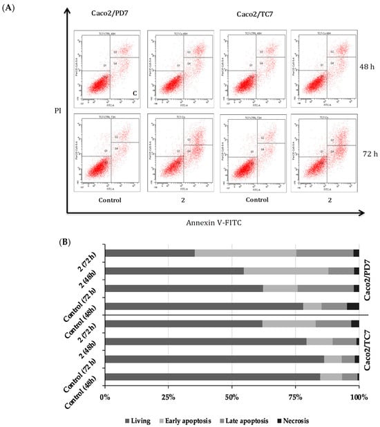 Since the complexes can reduce cell viability, the annexin V/propidium iodide double-staining assay was carried out to quantify the most active complex-induced apoptosis by flow cytometry. Treatment of Caco-2/PD7 cells with the benchmark drug auranofin led to most cells being found in late-stage apoptosis and necrosis (Figure S17, Supplementary Materials). After 48 and 72 h of incubation with the most active derivative [Cu{Au(Spy)(PTA)}2]PF6 (2), a decrease in cell viability was observed (Figure 3A), as the proportion of living cells was reduced over time, with the consequent increase in cells undergoing apoptosis: from a 35.8% of apoptotic cells (early + late apoptosis) in the case of control cells to 62.4% of total apoptosis for cells incubated for 72 h. In the case of the TC7 clone, control cells displayed inhibition of the apoptotic process, with 85% of cells exhibiting viability and a relatively low proportion undergoing cell death. This inhibition of apoptosis produces a fast growth and proliferation of cancerous cells. The population of early and late apoptotic cells increased to 35% after treatment with complex 1 in comparison with the vehicle-treated cells (12%). These results point to the apoptosis-inducing ability of the heteronuclear derivative in Caco-2 cells. Additionally, the effect observed after treating the cells with a dosage equal to the IC50 concentration is time-dependent. Thus, the proportion of cells undergoing apoptosis increases throughout the time, with a maximal percentage of apoptotic cells found after 72 h of incubation/treatment and the proportion of necrotic cells remaining considerably low for all the experiments performed.
