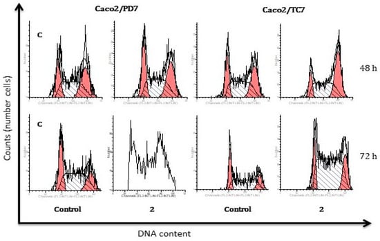 Effect of complex 1 on the cell cycle distribution of Caco-2/TC7 and Caco-2/PD7 cells after treatment with its IC50 concentrations for 48 h and 72 h.