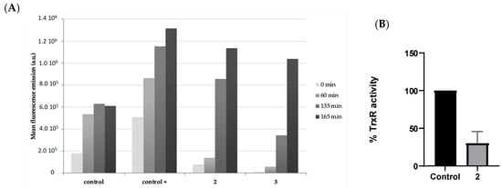 Determination of the activity of thioredoxin reductase (TrxR). The method is based on the reaction of 2,2′-dinitro-5,5′-dithiobenzoic acid (DTNB) with thiol groups of proteins to form the 2-nitro-5-thiobenzoate anion (TNB2−), which absorbs at λmax = 412 nm. The Caco-2 cell line (TC7 clone) was seeded in a 25 cm2 flask (2 × 106). After 24 h of incubation, the IC50 concentration of compound 2 was added for 24 h. Then, the cells were collected and lysed by M-PER® Mammalian Protein Extraction Reagent (reference commercial Thermo Fisher Scientific, 78501), following the supplier’s instructions. The interaction of metal complexes with the enzyme thioredoxin reductase was analysed using a thioredoxin reductase assay kit (Sigma, CS0170, St Louis, MO, USA). The procedural guidelines of the supplied kit were followed. The reaction started with the introduction of DTNB (100 mM), and the transformation into TNB was observed at 412 nm at 30 s intervals over 5 min, utilising a SPECTROstar Nano multi-plate reader from BMG Labtech. The outcomes were presented as a percentage representing the TrxR activity relative to the control. The non-treated cells’ activity was considered the control and estimated as 100% of activity.