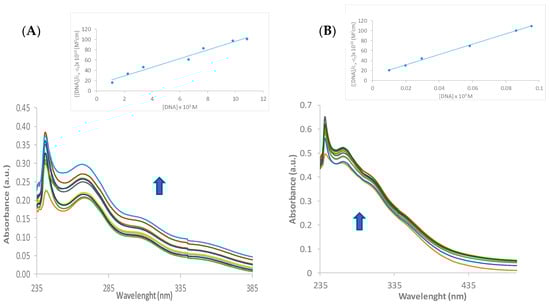 The binding capabilities of [Cu{Au(Spy)(PTA)}2]PF6 (1) and [Au(Spy)(PTA)] were estimated towards wheat DNA by recording the electronic absorption spectra throughout their interaction. The absorbance measurements were performed by successive additions of a DNA stock solution (10, 20, 30, 40 up to 100 μL) which afforded the final concentration of ct-DNA (from 0 to 100 μM) while maintaining the concentration of the complexes (20 μM). The electronic absorption study of both complexes showed an increase in the intensity of the bands centred around 240 and 260 nm (Figure 6). These spectral changes point to non-covalent interactions between the complexes and DNA, or simply to the uncoiled DNA double helix, and exposed more DNA bases. The non-covalent interactions may include hydrogen bonding and van der Waal’s attraction forces between the base pairs and the complexes. Hyperchromic shifts revealed the changes in DNA structure and conformation that occurred after the compounds bound to DNA, leading to structural damage to the DNA helix [82,83].