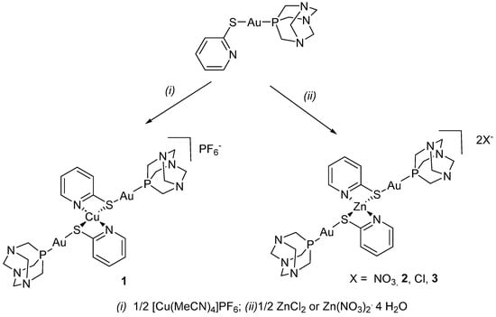 The reaction of [Au(Spy)(PTA)] (PTA = 1,3,5-triaza-7-phosphaadamantane) [49] with tetrakis(acetonitrile)copper(I) hexafluorophosphate in a 2:1 ratio under argon atmosphere led to a yellow solid that analyses as a trinuclear derivative [Cu{Au(Spy)(PTA)}2](PF6) (1). The use of Zn(NO3)2 or ZnCl2 in a 2:1 ratio in methanol affords the complexes [Zn{Au(Spy)(PTA)}2](NO3)2 (2) and [Zn{Au(Spy)(PTA)}2]Cl2 (3) as white, analytically pure solids in fair yield (Scheme 1).