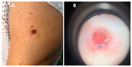 | Workup | The physical examination revealed an eroded nodule covered by crusts (Figure 2A). The dermoscopy revealed a central pinkish non-structural area with no visible vessels, few yellowish and dark grey globules, scales and positive “sticky fiber” signs (Figure 2B). |