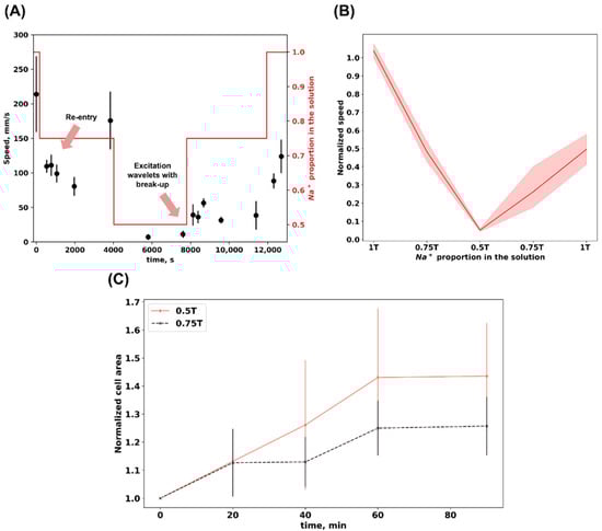 Optical mapping of a cell monolayer provides highly reproducible results and allows the neglect of the curvature of the wavefront in three-dimensional space, reducing the number of factors that can affect the occurrence of various nonlinear patterns in excitable tissue. However, each sample has a different initial calcium wave speed, and these speeds are often not comparable to each other. Therefore, to compare experimental results, we normalized the speed to the average value during incubation at 1T for each sample. The data in all figures are expressed as mean (SD). The Friedman test was used to test whether there was a statistical difference in speed over time. For all results, p < 0.05 was considered significant. Visualization and statistical analysis were performed in Python (v3.10.13) using Matplotlib (v3.8.2), Seaborn (v0.13.2), and SciPy (v1.11.4).