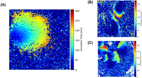 In order to evaluate arrhythmogenicity and calcium dynamics spatial patterns, optical mapping data were phase processed with an open-source Python library, optimap (v0.2.2) [33,34]. Videos were normalized with sliding-window pixel-wise normalization (window size of 60 frames). Each wavefront was characterized by rotational activity (spiral waves), wave breaks, and phase singularities. Spiral waves were assessed with quantification of rotations and duration. The total number of spiral waves and phase singularity sites were calculated. A minimum of two rotations was used as a threshold to define a significant rotational activity, and three or more simultaneously activated sites were considered as fibrillatory activity.