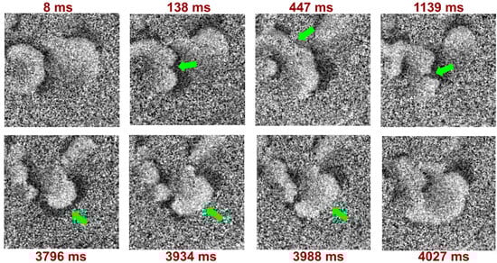 Calcium wave optical mapping results in 0.5T solution. Calcium multiple wavelets of excitation with wave breaks, detected 7603 s after the start of the experiment and 3583 s after changing the solution from 0.75T to 0.5T. The dark area represents the zone of depolarization and calcium signal activation, and the light area represents repolarization. The green arrows show areas with wavelet break-up.
