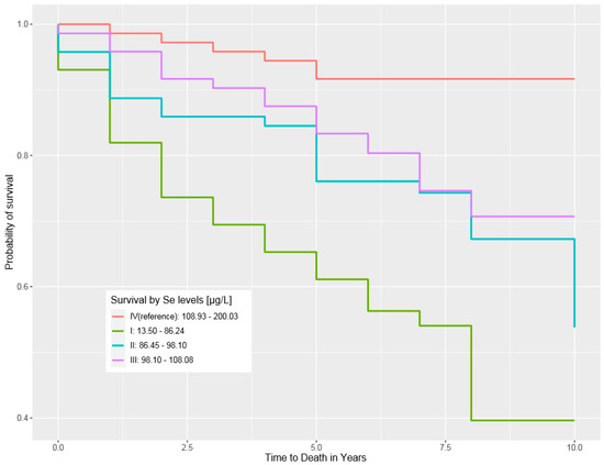 The correlations between levels of Se in blood/serum and ten-year survival are presented in Table 4 and Table 5 and in Figure 1.