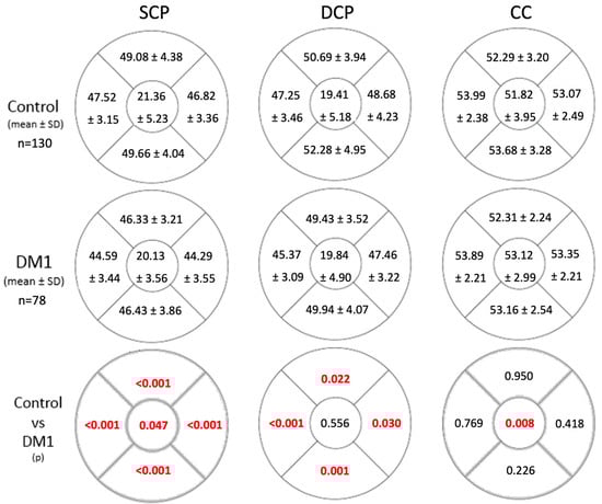 Flow values in the superficial capillary plexus (SCP), deep capillary plexus (DCP), and choriocapillaris (CC) in the control group and the DM1 group. Statistically significant differences between flow values of both groups are indicated in the lower grid row in red (p < 0.05). Abbreviations: SCP, superficial capillary plexus; DM1, type 1 diabetes mellitus; p, statistical significance level. Blood flow is measured as the % of pixels with a positive sign relative to the total pixels in the studied area. The figures represent a right eye.