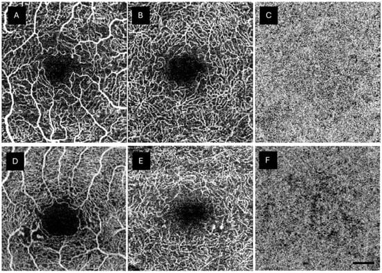 Anatomical changes shown in the type 1 diabetes mellitus (DM1) group by optical coherence tomography angiography (OCTA). (A) shows abnormalities in the foveal avascular zone. (A,B,D) depict capillary drop out. (D,E) display microaneurysms in both SCP and DCP, respectively, surrounded by areas with capillary loss. (C) shows a normal choriocapillaris plexus (CC), while (F) reveals a lack of capillaries in the CC. The scale bar (lower right corner) represents 500 microns.