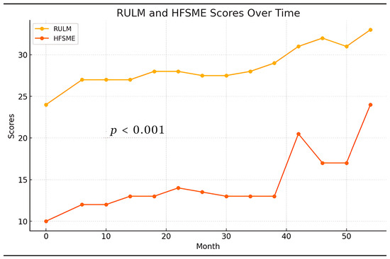 Due to varying dropout rates in the treatment data, we imputed the missing values with the median values calculated for each specific month to enable the use of the Friedman test. The significant p-values (<0.001) for RULM and HFSME scores indicate statistically significant differences across time points. This suggests that the scores on both scales change significantly over time. The results are presented in Table 6.