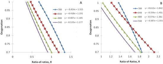 We have simulated the ratio-of-ratios R as a function of tissue arterial blood oxygenation (Equation (13) with Equation (14) as a constraint) for several commonly used infrared light wavelengths (780, 840, 880, and 940 nm), assuming a constant red light wavelength (λ1 = 660 nm). As described in Section 2.2.4, we have simulated two scenarios: (a) the pulsatile volume is on the arterial side, and (b) the pulsatile volume is on the venous side. They are depicted in Figure 1A,B, respectively. Note that variables in Figure 1 are transposed in line with the common way of displaying these data (SpO2 as a “ratio-of-ratios” function).